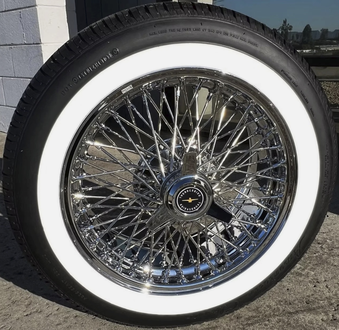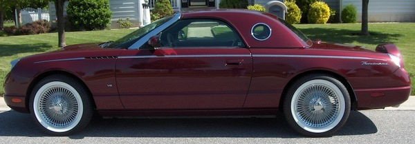 Thunderbird Wire Wheels – 2002-2005 – Set of 4. The only wire wheels available for the 2002-2005 Thunderbird anywhere! Give your Thunderbird an elegant ‘Retro’ look with our new ‘Classic’ wire spoke wheels. This stunning wheel is American-made, hand-assembled, and features a 72-spoke triple cross pattern design and brilliant mirror finish chrome plating on 17″ rims to fit the OEM Thunderbird tire. Also includes your choice of 2 or 3-ear ‘Spinner’ style hubcap.